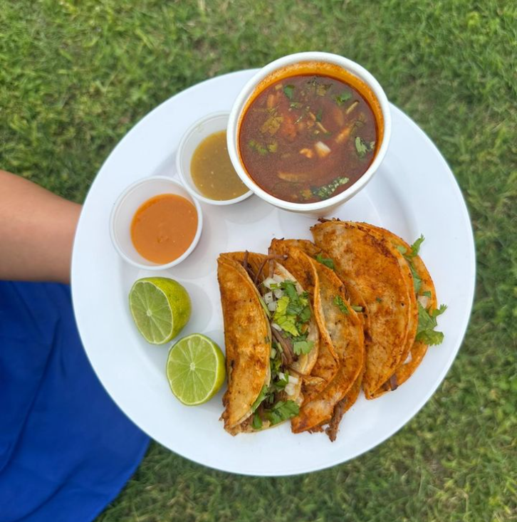 Three soft corn tortilla tacos filled with various stews: Chorizo con papa (potato and mexican sausage), Chicharron (pork rinds cooked with adobo salsa), and bacon beans. Served with a cabbage and carrots salad and your choice of mild green or spicy red salsa.